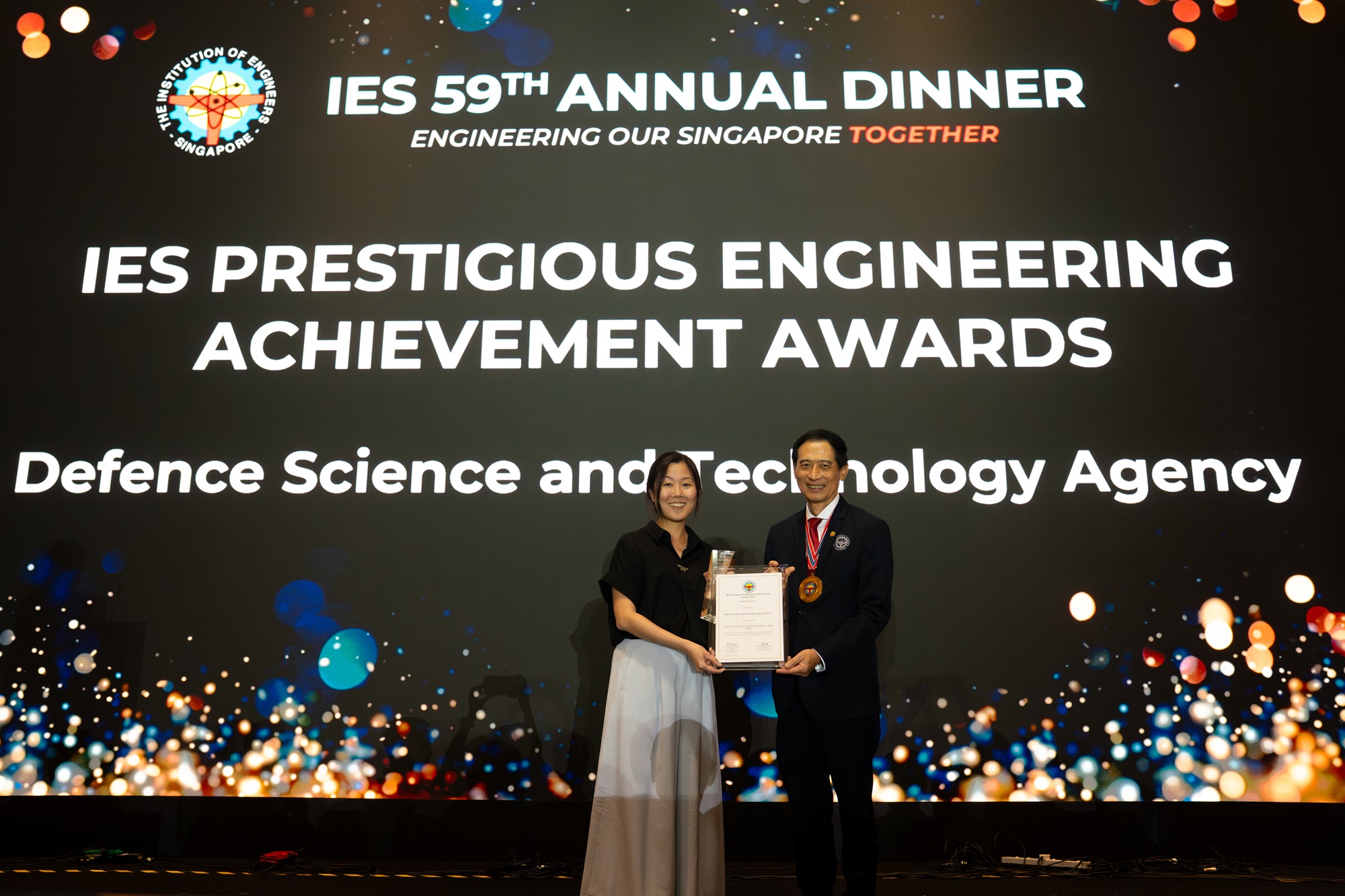 Director Simulation and Training Systems Yeoh Ee-Wen (left) received the award from IES President Er. Chan Ewe Jin (right) at the dinner.